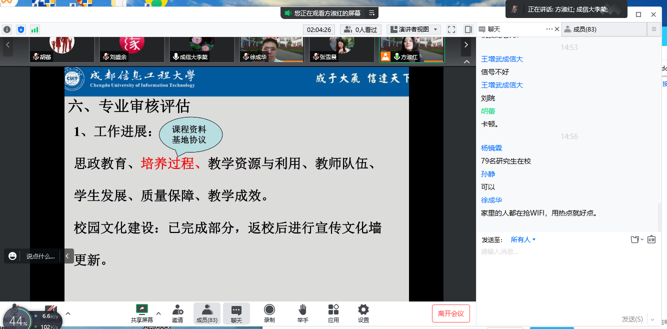 其次,副院长方淑红就新学期本科教学工作进行了安排。主要包含线上授课、新进老师试讲、毕业论文双选、大学生创新创业项目申报、专业教育以及专业审核评估工作,并重点对专业审核评估的进展进行了阶段性总结和后续工作的安排。