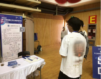 图左 褚永彬老师在展位上 图右 小组成员向同学介绍展示项目