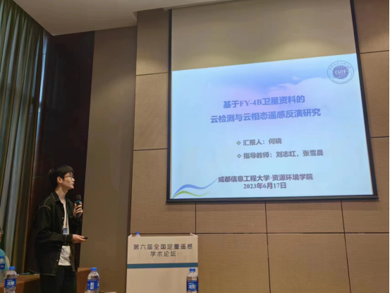 遥感191班的学生,于2023.6.15-6.18参加了在成都召开的第六届全国定量遥感学术论坛,该班何晓同学做了学术报告,是该论坛唯一作报告的本科学生。报告题目“是基于FY-4B卫星资料的云检测与云相态遥感反演研究”,指导老师是刘志红教授和张雪晨博士。