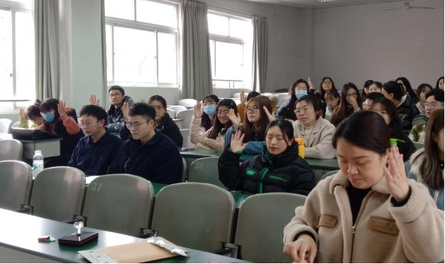会议分为两个环节。首先是转正大会。主持人宣读会议要求及会议纪律后,由13名预备党员宣读转正申请书,汇报他们近一年的思想、学习及工作情况,找出缺点和不足,表明自己的态度和决心。