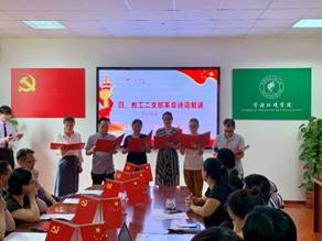 在国歌声中拉开序幕,全体师生党员用诗词共同颂扬党的丰功伟绩,赞美党的美丽华章。教师党支部李剑锋、卞玉霞、夏志业、陈军、仙巍、刘志红、冯文兰、卢晓宁、郑忠、江慧、欧美娅、方淑红、杨怀金、印红玲、陈方方、张菊、杨迎春等17位教师党员,声情并茂地朗诵了革命诗词《七律·人民解放军占领南京》,《沁园春·雪》,并介绍了作品的背景,深情表达了教师党员们对建党百年的深深祝福。学生党支部15位党员代表,用饱满的热情和激昂的语言朗诵了毛主席的诗词《沁园春·长沙》,体现了年轻学生党员的青春活力风采与革命精神的传承。