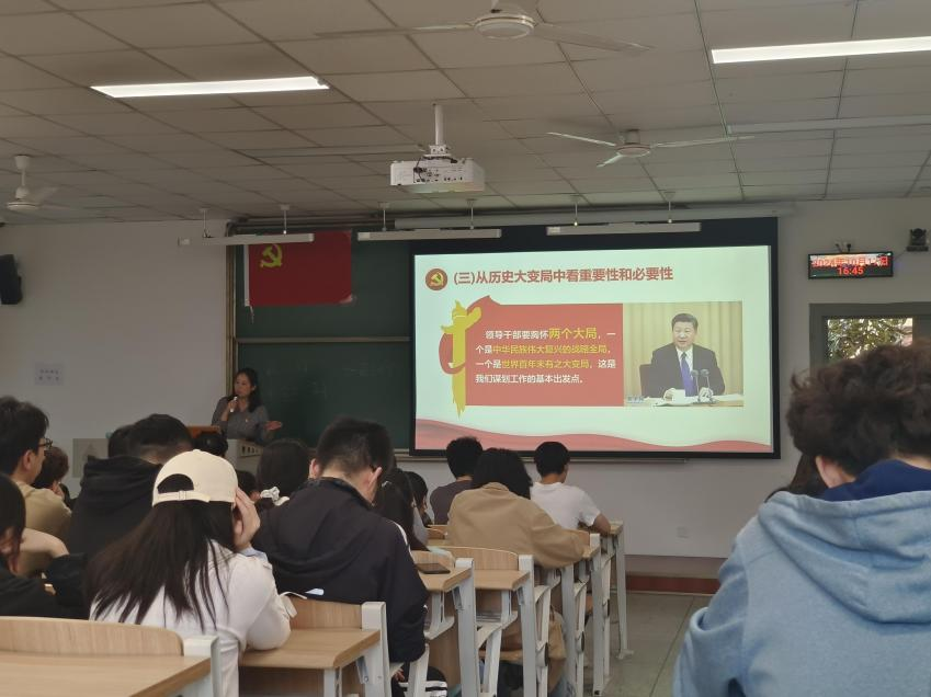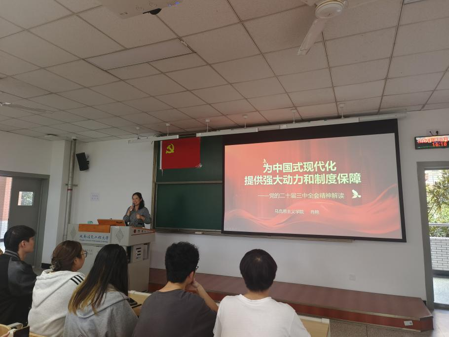 党委组织师生党员在1307教室进行专题学习,邀请马克思主义学院肖艳老师做《为中国式现代化提供强大动力和制度保障---学习党的二十届三中全会精神》专题报告。