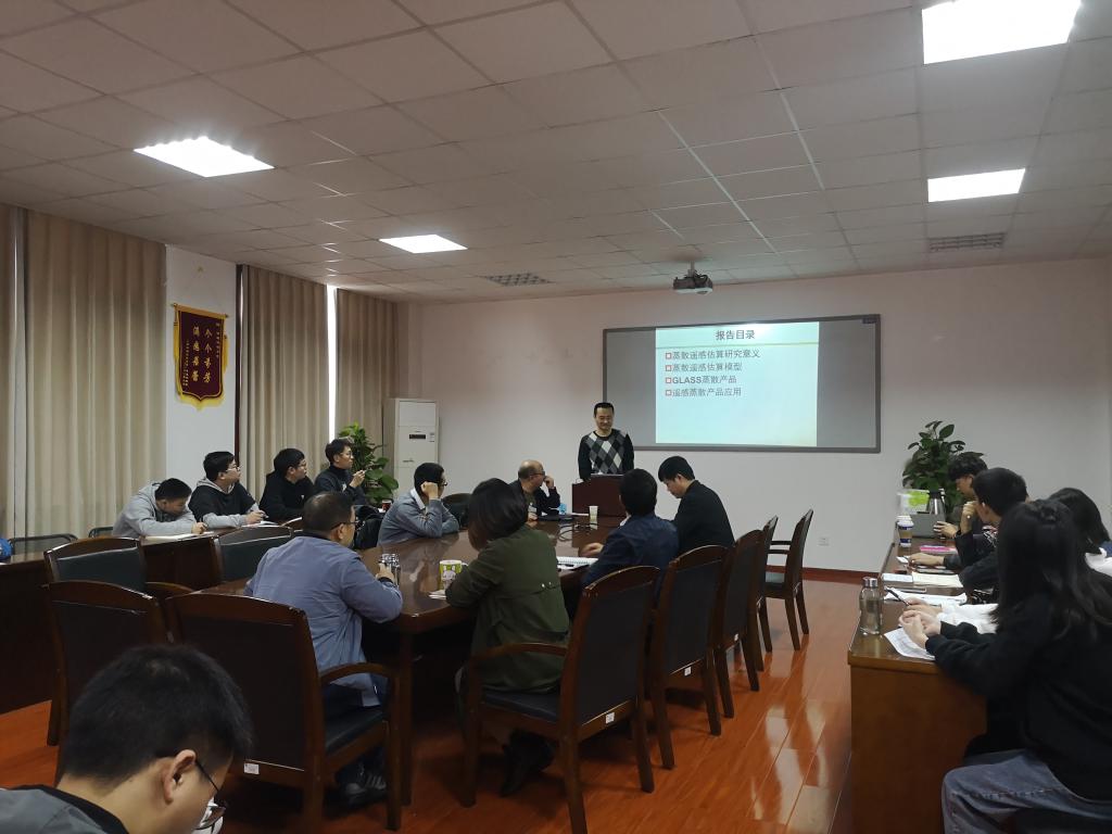 在柳锦宝副院长向学院教师和学生介绍了三位来宾的基本情况之后,学术讲座正式开始。首先,姚云军教授围绕地表蒸散遥感估算研究这一主题进行演讲。姚云军教授为学院师生详细的介绍了地表蒸散的遥感估算模型,并展示了由贝叶斯方法融合MOD16,RRS-PM,PT-JPL,MS-PT和UMD-SEMI五种潜热通量算法估算得到的GLASS蒸散产品。演讲结束后,姚云军教授与学院师生就地表蒸散遥感估算模型、GLASS蒸散产品精度及该产品反演算法的适用范围等方面展开了热烈的讨论。
