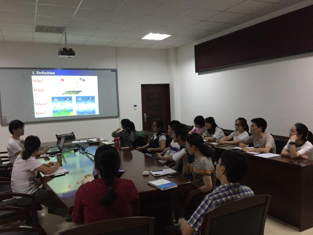 部分教师及研究生参加了第七期学术沙龙。由崔林林老师为大家讲述题为“Assessment of atmospheric correction methods for historical Landsat TM images in the coastal zone”的研究。此项研究工作主要是在中国科学院地理科学与资源研究所攻读博士学位期间完成的。内容包括:电磁波辐射传输过程、大气校正概念的界定、大气校正方法研究进展、存在的科学问题、研究方案的确定、结果分析和研究亮点等几个方面;针对滨海区域水汽交换频繁,大气水汽含量较高和气溶胶类型复杂等特点,选择4种DOS模型对苏北滨海湿地区域的1980-2002年的四期Landsat TM数据进行实验分析。此研究详细系统地验证了DOS模型在滨海区域的适用性特征,为本学院即将开展的研究工作奠定了良好的基础。报告结束后,到会的老师及同学对于大气校正模型中有关气溶胶影响贡献分离、模型实测数据验证及模型区域适用性等问题进行了深入的交流和探讨。