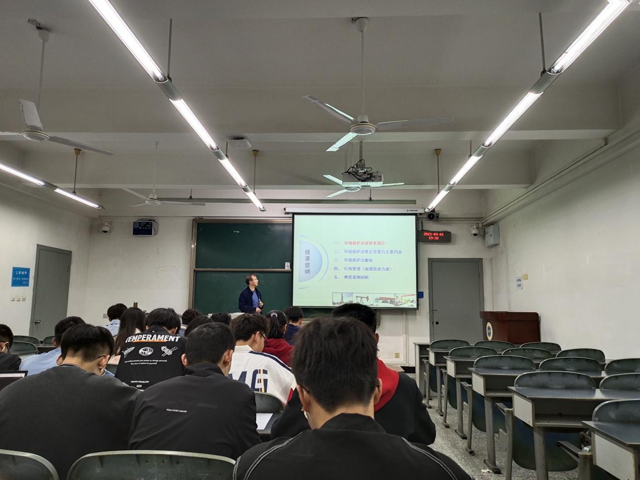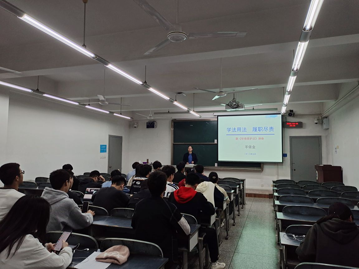 优秀教授羊依金教授在H4303为环境工程202学生开设以“学法用法,履职尽责”为主题的新《环境保护法》讲座。