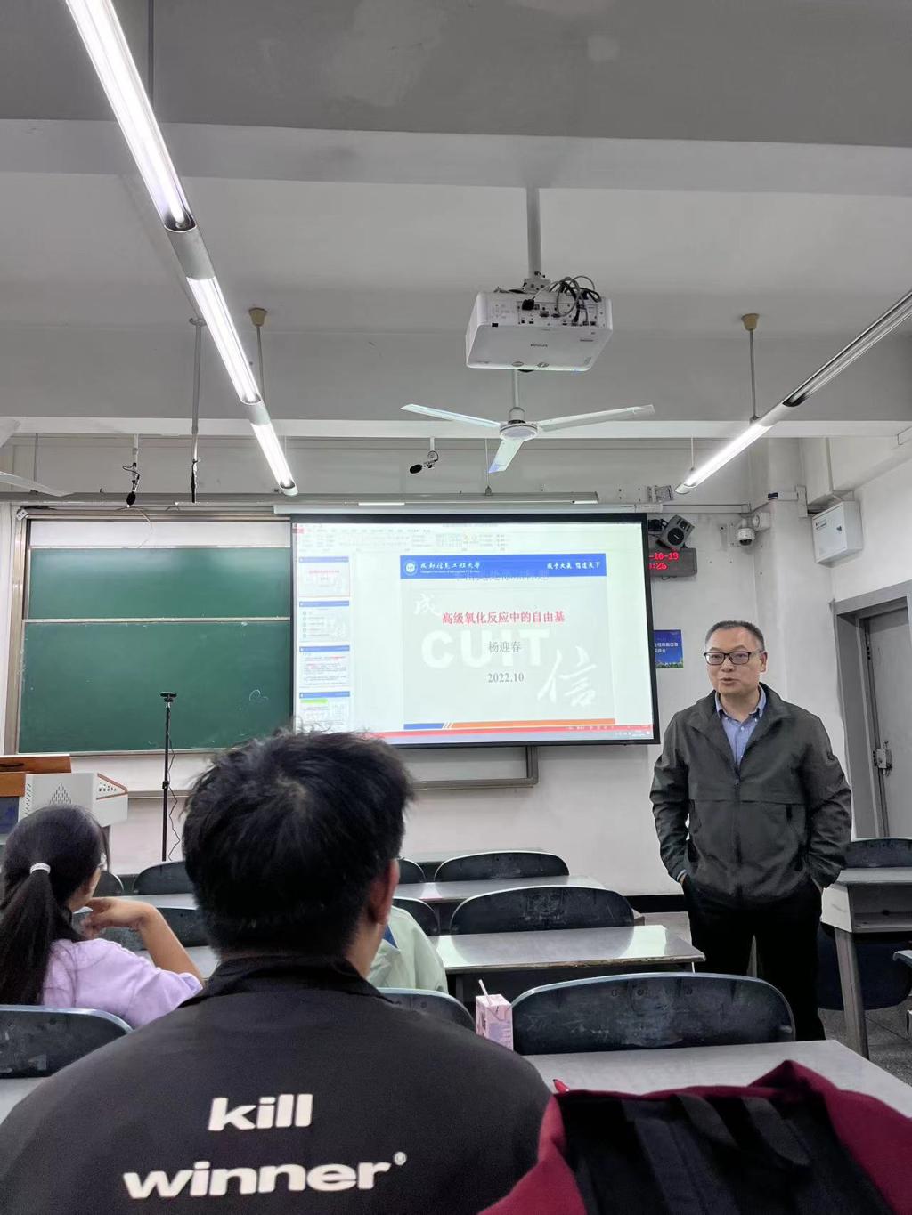 讲座结束,同学们以热烈的掌声感谢杨教授的此次演讲。教室中杨教授声情并茂,神色飞扬;同学们认真听讲,积极思考。此次讲座内容精彩深刻,同学们均受益匪浅。杨教授在讲座中的细致讲解让同学们深刻了解到自由基的应用,使同学们进一步认识到高级氧化反应中的自由基。总体来说,此次讲座达到了应有的效果并取得了成功。