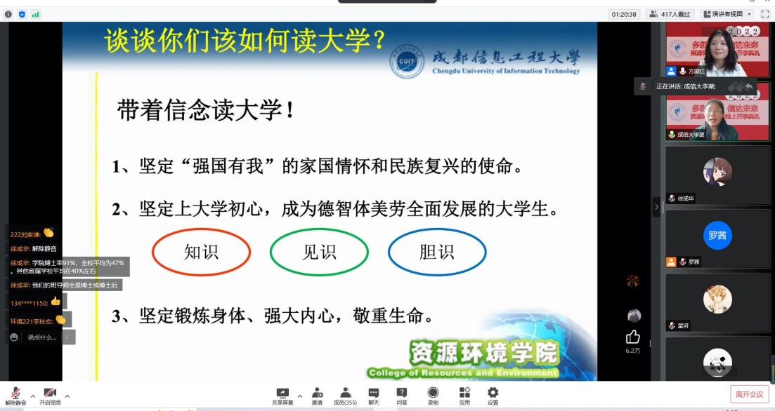。同时,徐院长也对同学们提出了自己的希望与要求:希望同学们勿沉迷于网络游戏,多了解国家大事、国际形势;希望同学们加强身体锻炼,保证全身心投入大学生活;为了更快融入大学生活,希望同学们务实创新,在快捷生活中静下心来做实事;希望资环的同学爱党爱国,具有成于大气,信达天下的心怀。