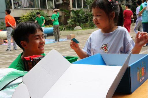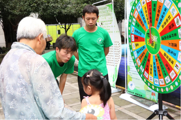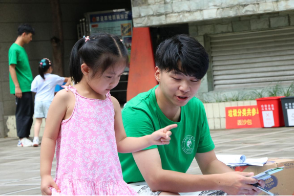 旭晴小分队继续采用小游戏的方式进行环保知识科普。第一个小游戏是改编版大富翁:所用的游戏地图每一格都对应着不同类别的垃圾,如有害垃圾、厨余垃圾、可回收垃圾和其他垃圾,投掷骰子后将前进相应格数,说出格子中垃圾的分类即可得分;第二个小游戏是丢沙包:沙包上系有纸条,纸条上写有垃圾的名称,根据垃圾的分类将沙包投进对应的垃圾桶中即可得分。随着活动的进行,现场吸引了越来越多的小朋友,现场气氛活跃,充满欢声笑语。孩子们在玩耍中学习了知识,领悟了垃圾分类的小技巧,相信他们也会将这些知识、技巧应用到实际生活中。