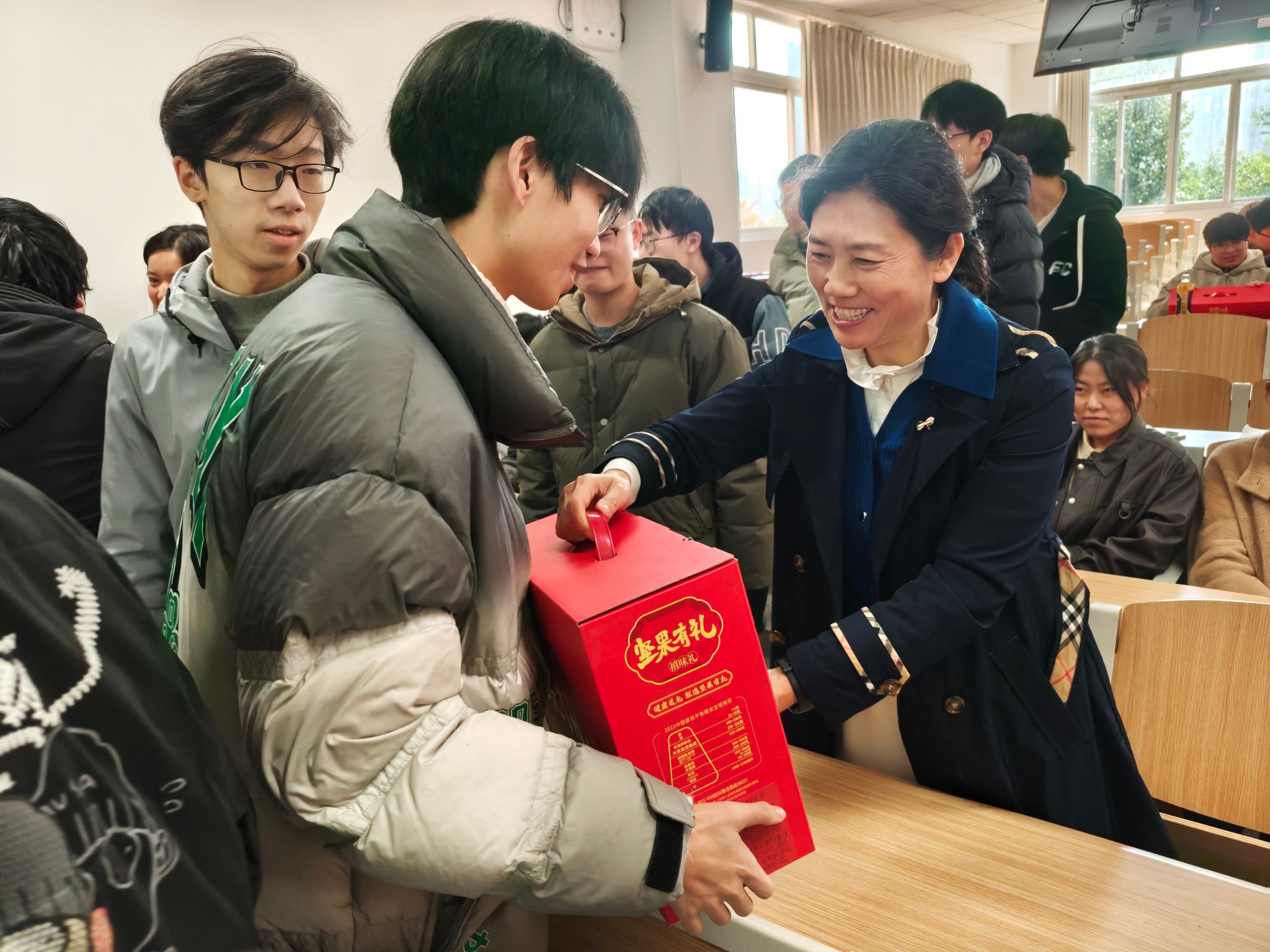 在1307教室举办 “今日厚积薄发 明朝稳握胜果”研途送温暖活动。徐成华院长、李蕖书记、方淑红副院长、卞玉霞副书记与辅导员江慧一同将暖心礼盒送到考研学子手中,为冲刺备考的同学们加油鼓劲、传递温情。