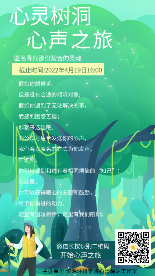 开展“心灵树洞,岁月与共”线上心理健康活动。本次活动旨在引导大学生诉说心声,增强自我心理认知能力,关注自身心理健康,提高心理素质。