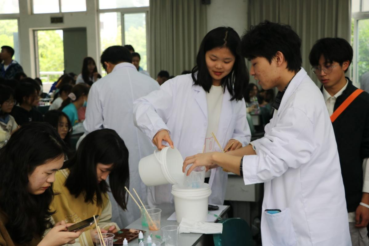 欧美娅老师为大家讲解了手工皂的制作步骤和制作中的注意事项,并提醒同学们操作过程中注意安全,讲解完成后指导在场同学分组进行手工皂的DIY制作。在同学们制作肥皂的过程中,学校与学院领导和同学们进行深入交流,展现出领导们对同学们心理健康的关心与重视。